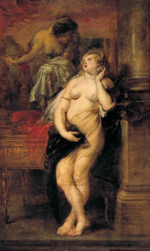 ディアネイラといえば川岸でネッソスに略奪される場面が多いでしょう?これはそのあとの場面で、夫ヘラクレスの浮気に、ネッソスにもらった愛を取り戻す秘薬を、ヘラクレスの服に使うことを考えている場面ではないかと考えたんだけど。