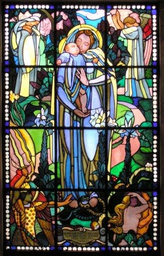 このステンドグラスが、モーリス・ドニ美術館のある礼拝堂を装飾しているけれど、これが「百合の聖母」(聖母の接吻)なわけだよね。下にはアダムとエヴァ(イヴ)も。